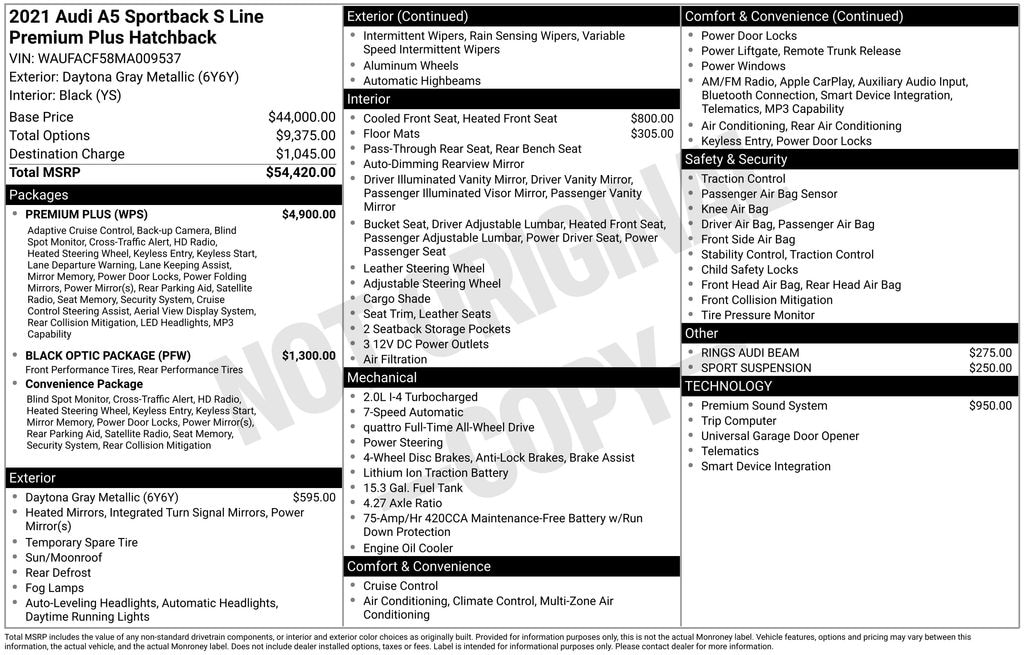 2021 Audi A5 Sportback, Prestige, 45 Engine, Navara Blue with Black Ops Package. Pretty much have every option as an A5 can have and truly impressed with the car to date. Get's mpg's as advertised and does get up and go when needed. Reliability score was based on to few miles to really score. Departed a 2009 Saab 9-5.…