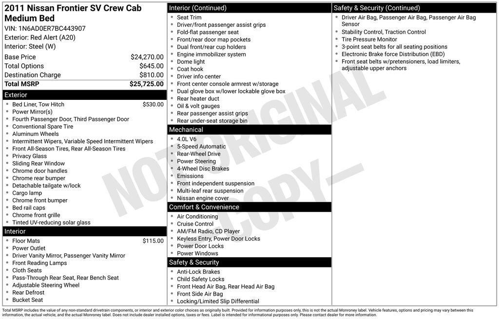 Recent Arrival! Red Alert Metallic 2011 Nissan Frontier SV 4.0L V6 DOHC.