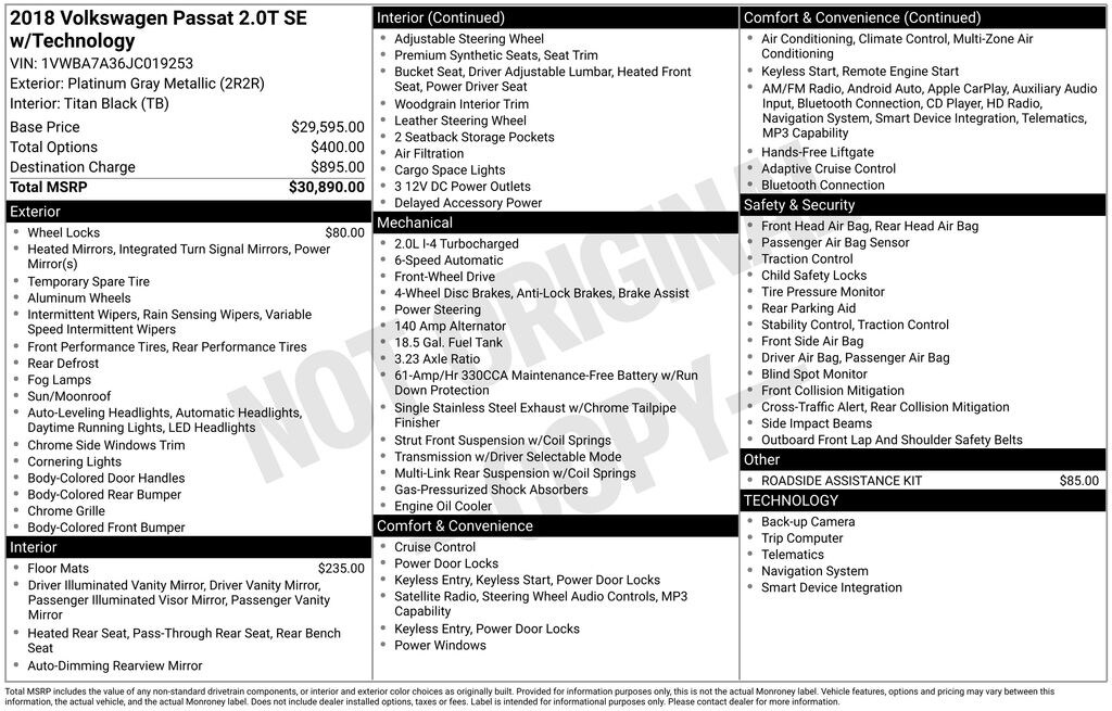 Boasting a sleek and sophisticated exterior in a timeless Gray hue, this Passat commands attention on the road. Under the hood, the powerful 2.0L TSI engine, paired with a 6-Speed Automatic with Tiptronic transmission, delivers an impressive balance of efficiency and responsiveness, with an EPA-estimated 25 city/36 highway MPG.